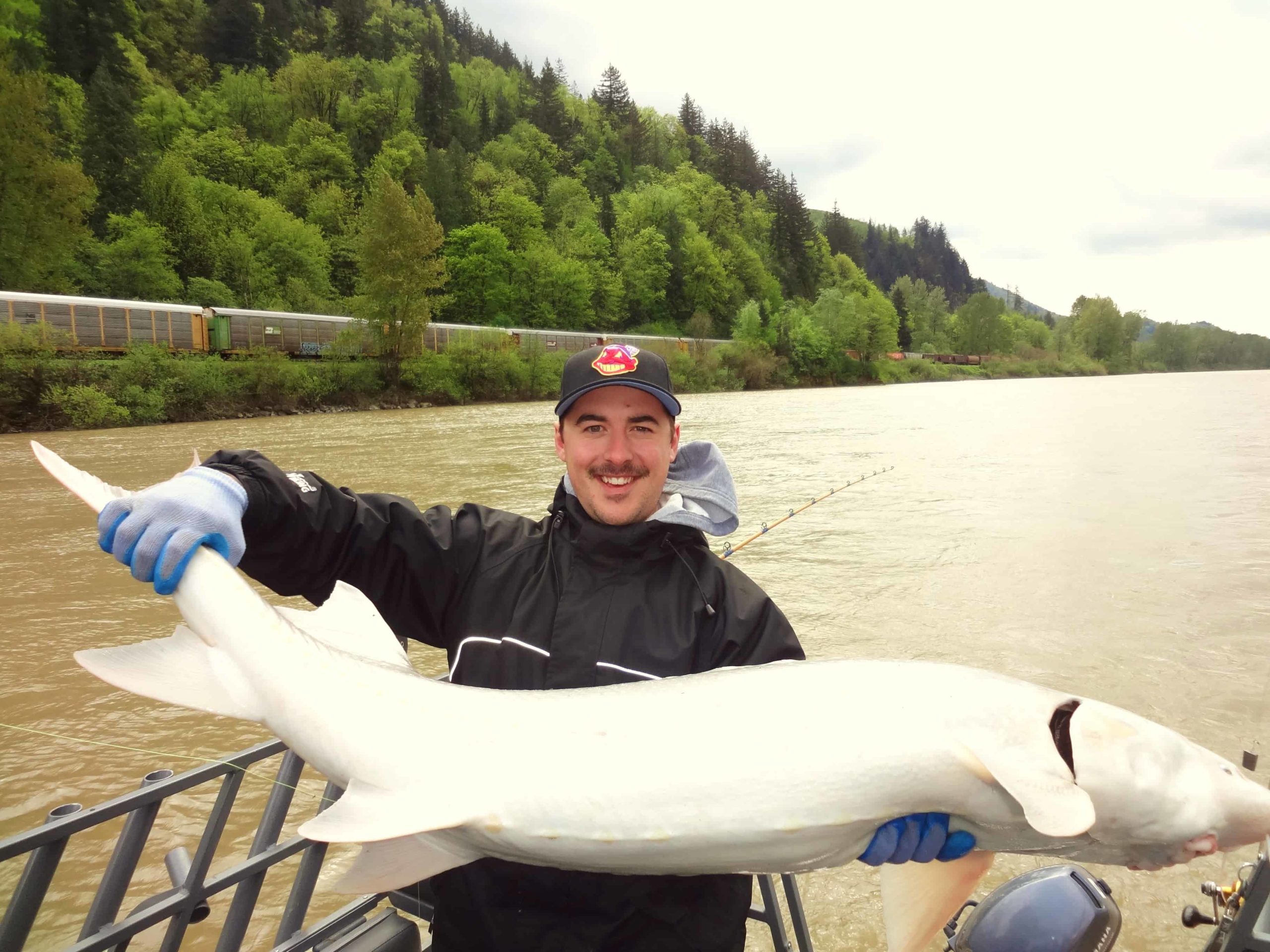 The river levels were very high due the week’s heavy rain that ignited the spring run off. Due to these high waters the water clarity was minimal; there was a lot of debris coming down river which made the fishing conditions very difficult. Our plan was to cover numerous spots on the river so we could drop our lines in front of as many fish as possible. The bait of choice for the day was Hooligans (small anadromous ocean fish, also known as Candlefish, Eulachon, Ooligan). The Hooligans were spawning in the river system and providing a good food source for the Sturgeon. The Sturgeon were aggressively feeding on these fish which causes them to be very plentiful in form. Due to these bait fish being very oily it makes the Sturgeon to take on a distinct bright white colour when feeding on them.