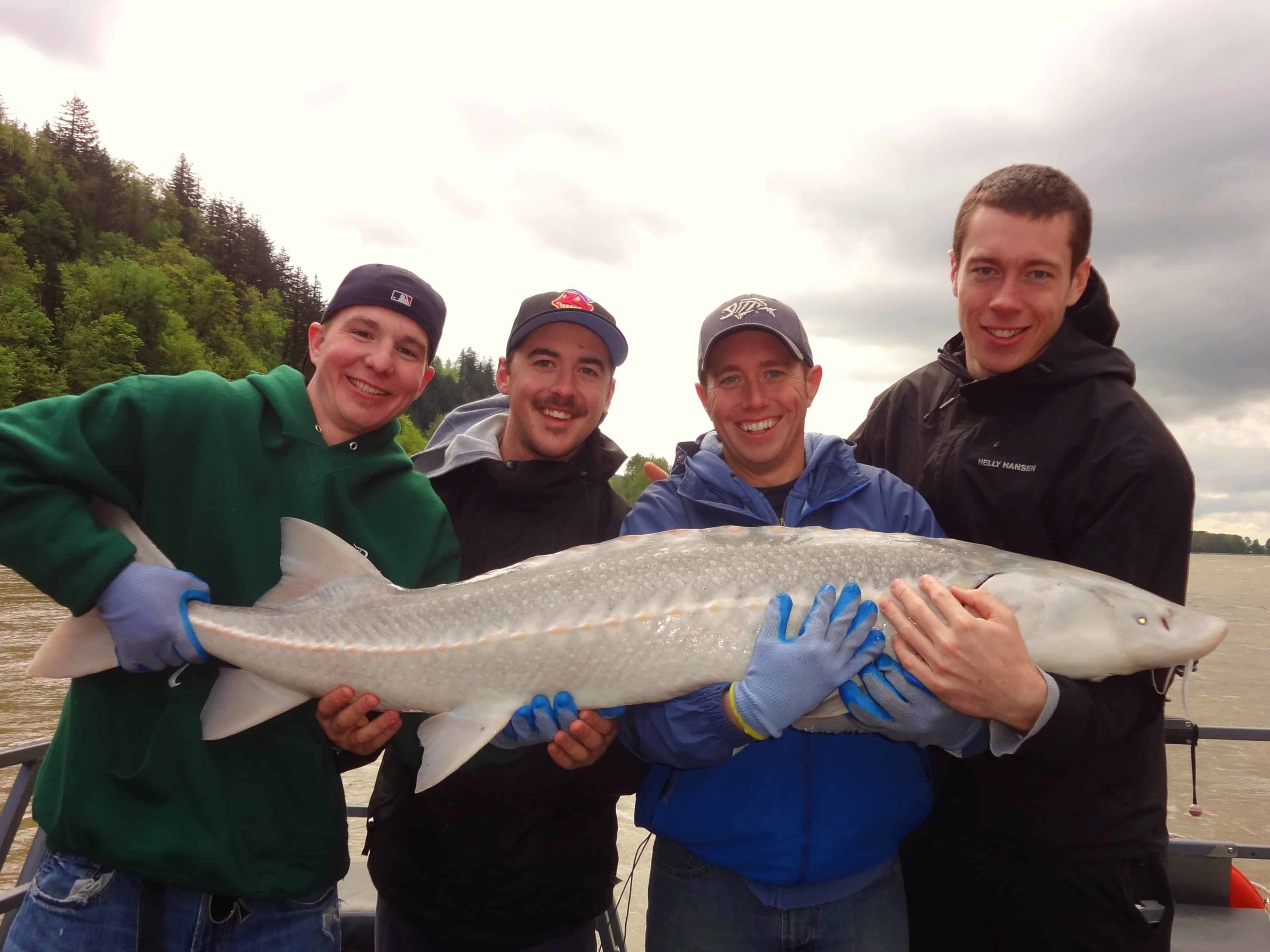 The weather started to improve in the late afternoon. We anchored down near a set of rail road tracks. A couple of hours went by and finally…BOOM! We hooked into a decent Sturgeon. Greg took the rod and set the hook, it was his first Sturgeon fight and he was smiling like a 10 year old on Christmas morning. After about 10 minutes of a decent fight Greg brought it to the boat for some great photo opportunities. We released the fish back into the water for another day.
