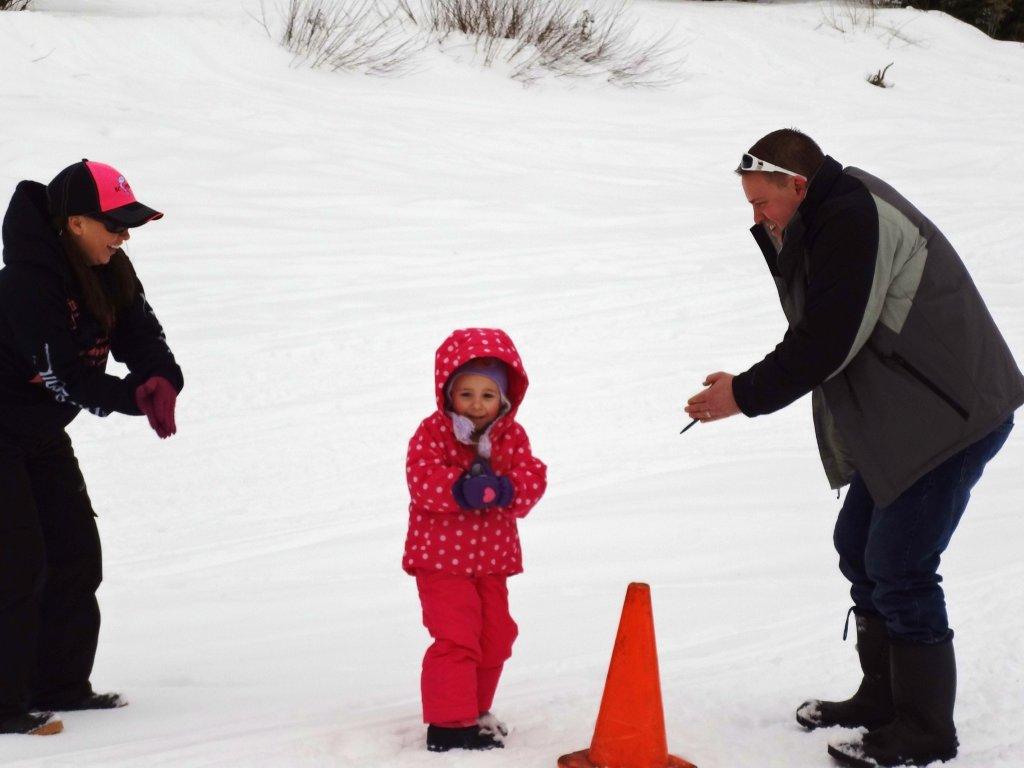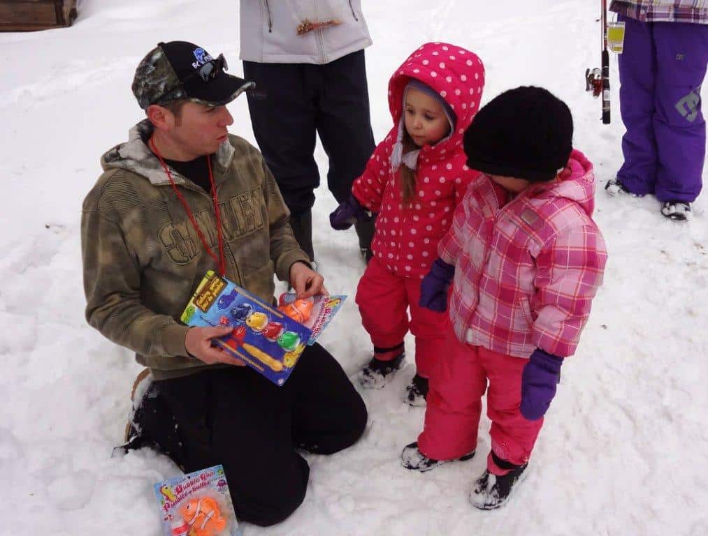 After lunch was served, the OFGC volunteers had some fun games planned for everyone. The youth learned how to cast a fishing rod by taking part in a casting challenge. The game involved casting a bobber towards cardboard fish targets on the ice. Once they finished their turn they were awarded with a prize courtesy of BCFishn.com.